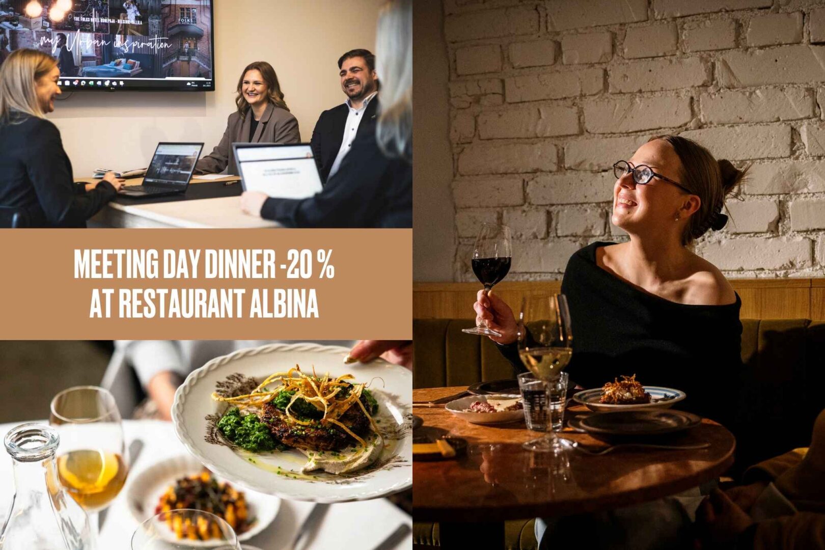 Continue your inspiring meeting day over a shared dinner – a delicious dinner at Restaurant Albina at a discounted price until the end of April.