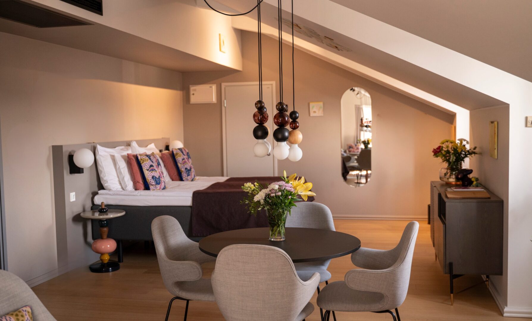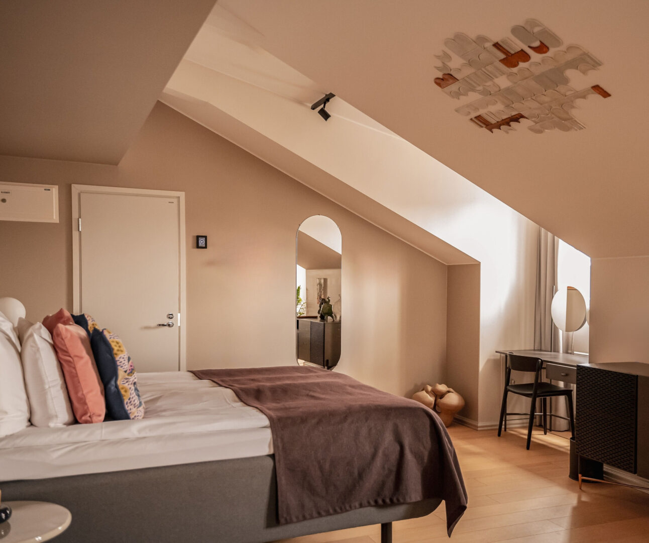 The Atelier on hotellimme ylellisin sekä mielenkiintoisin huone. The Atelier sijaitsee hotellin historiallisen rakennuksen ylimmässä kerroksessa. Huoneesta on avarat näkymät Konepajalle ja huoneessa on kaunis viisto katto, sekä kiinnostavaa taidetta ja design-elementtejä.