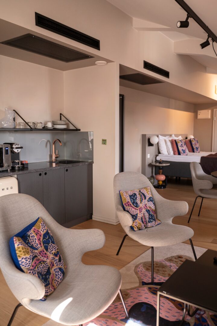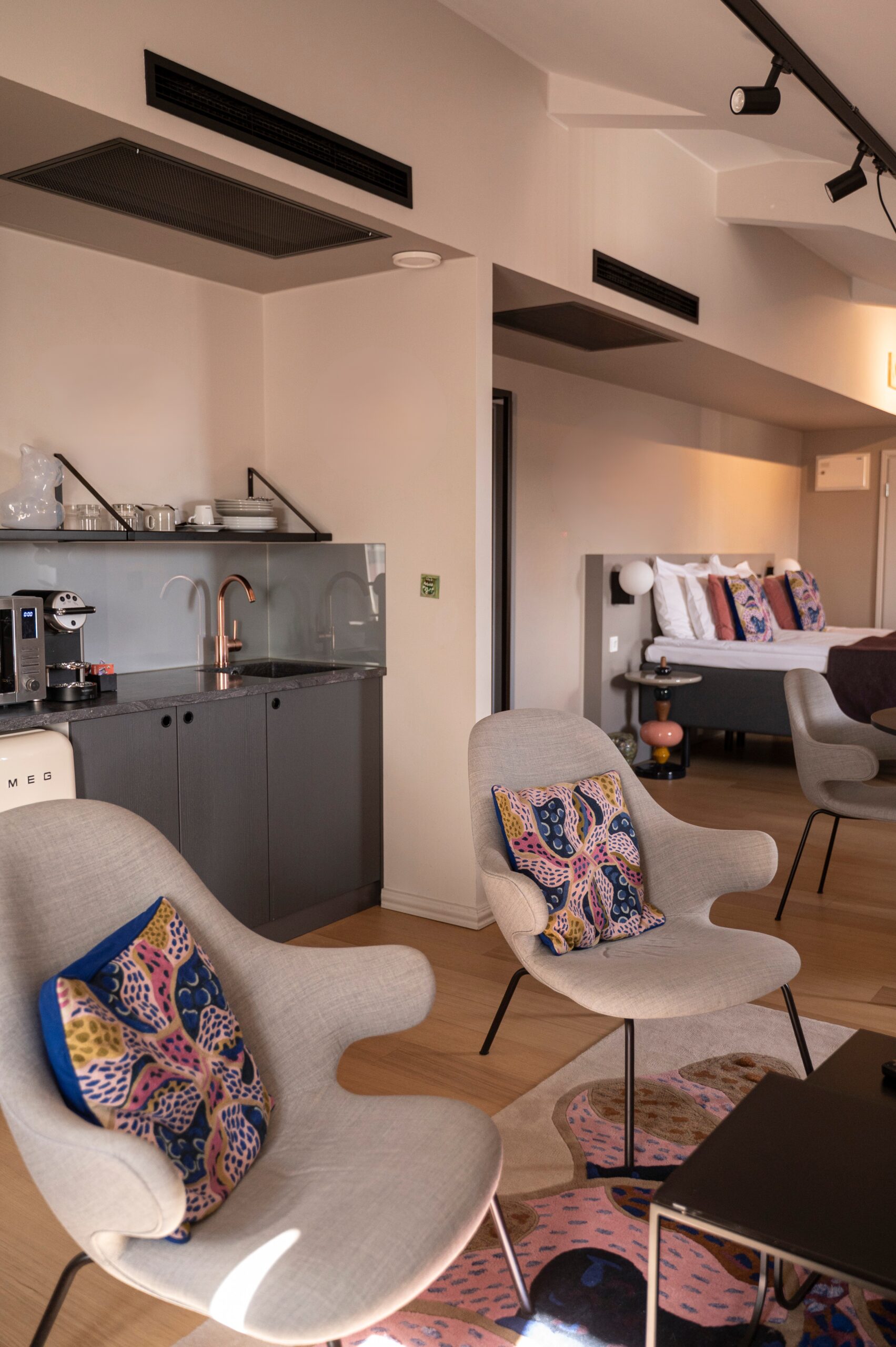 Kylpyhuoneen ylellinen tassuamme kutsuu päivän hemmotteluhetkiin. Huoneessa on sohvaryhmä, ruokapöytä ja hyvän unen takaamiseksi Tempur sängyt. Keittiönurkkauksesta löytyy Nespresso-keitin, teesetti sekä mikroaaltouuni. Atelier-huoneessa on kotimaista taidetta.